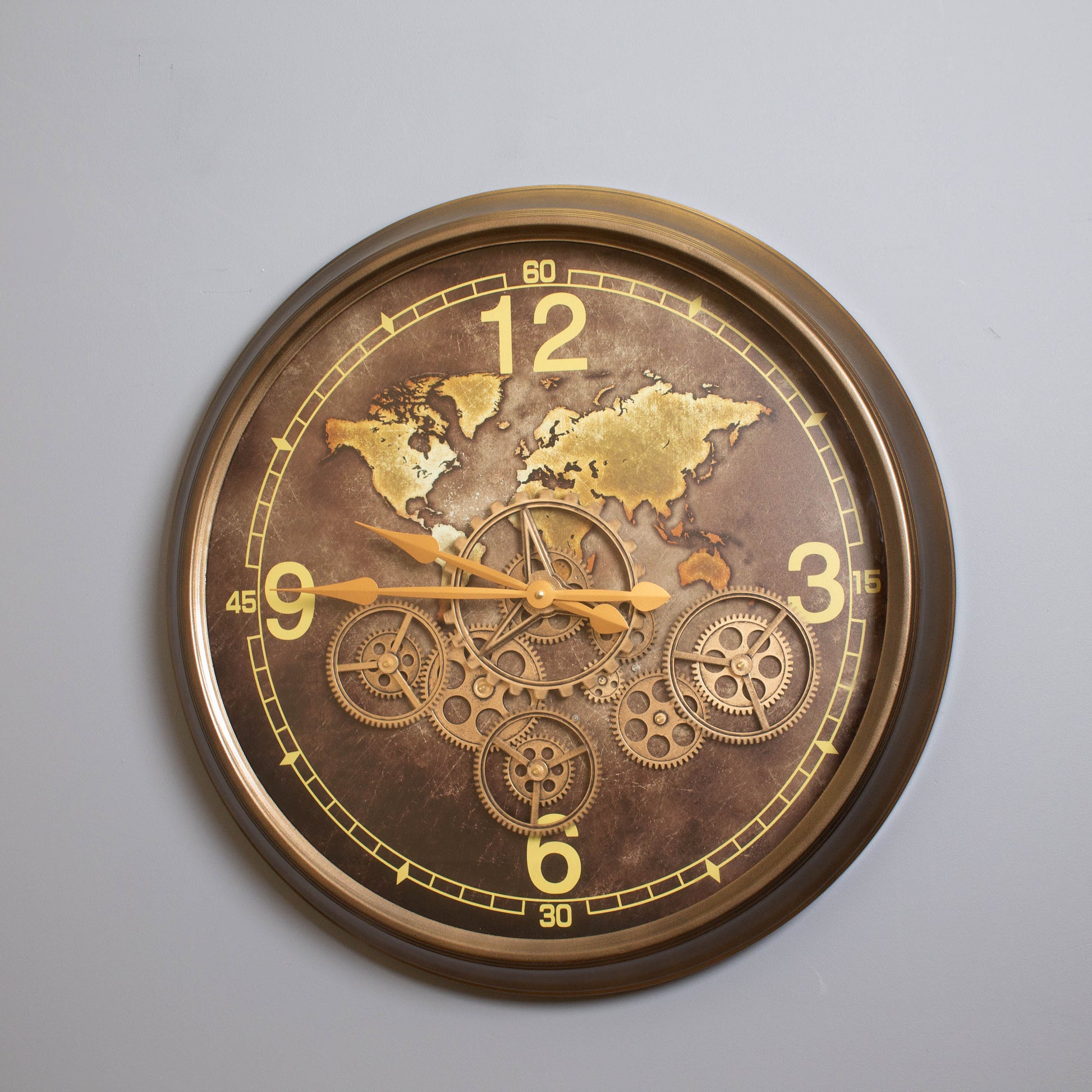 Discover the beauty of time with our World Map Cog Clock! This stunning timepiece with it's antiqued background features a detailed design of a world map with burnished gold and bronze detailing. Measuring 62 cm, it's the perfect addition to any room. Globetrotters will love it!
